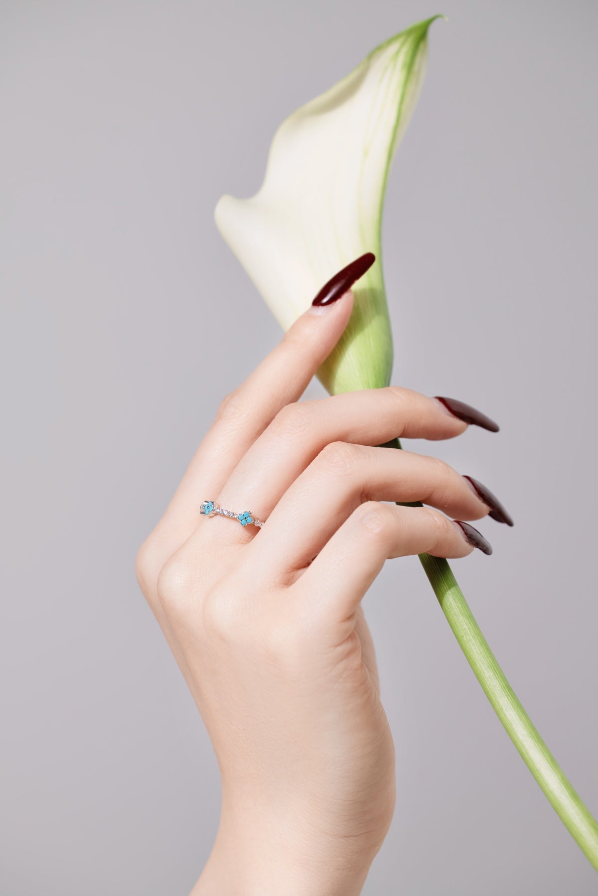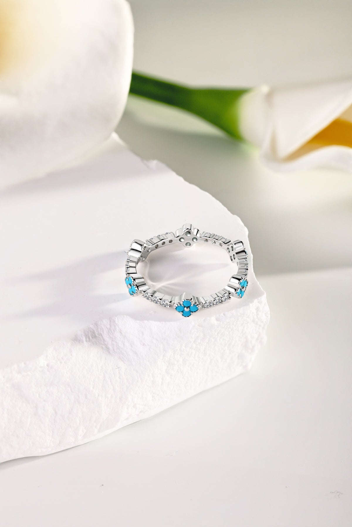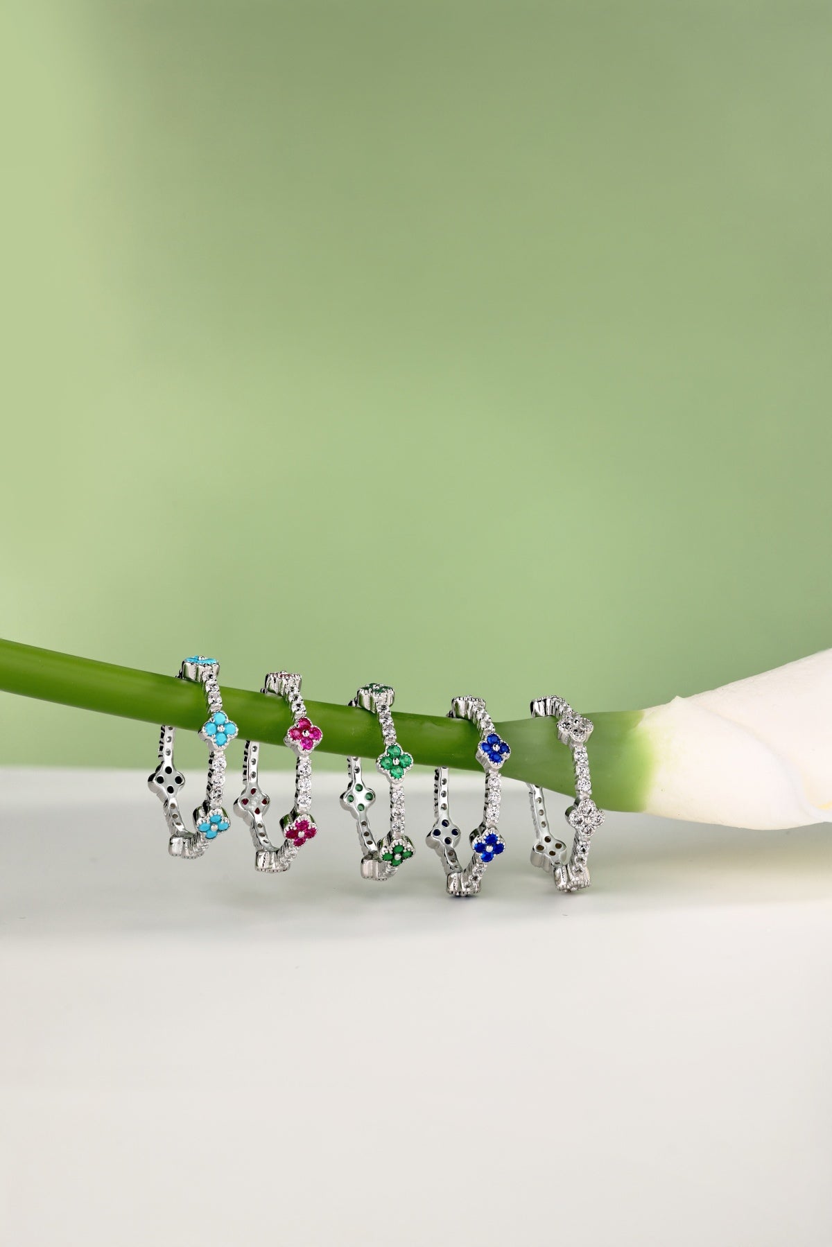 This elegant eternity band features delicate clover-shaped accents adorned with bright blue enamel, interspersed with sparkling stones. The perfect blend of playful design and sophistication, this ring makes a unique statement for everyday wear or special occasions.