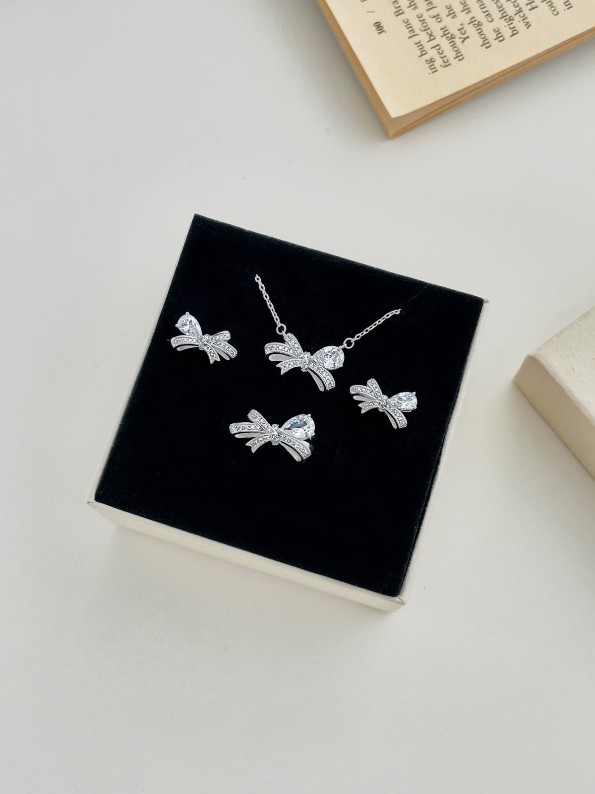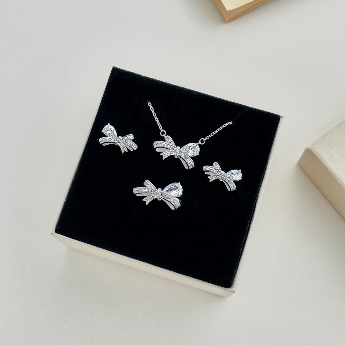 A graceful silver ring featuring a pear-cut stone complemented by a sparkling bow design, perfect for an elegant and feminine touch.