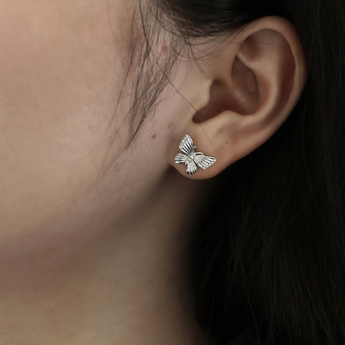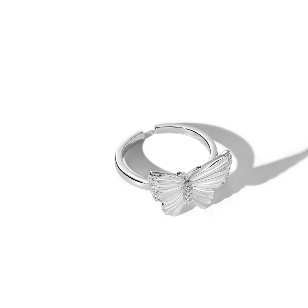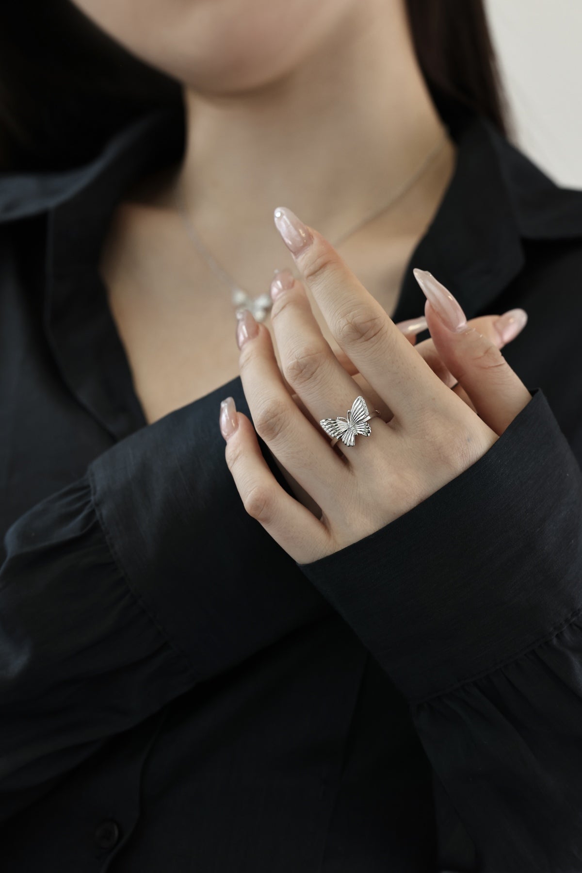 A delicate butterfly-inspired jewelry set, crafted with intricate wings and encrusted with shimmering stones. This set includes a necklace, ring, and matching earrings, adding a whimsical yet elegant touch to any outfit.