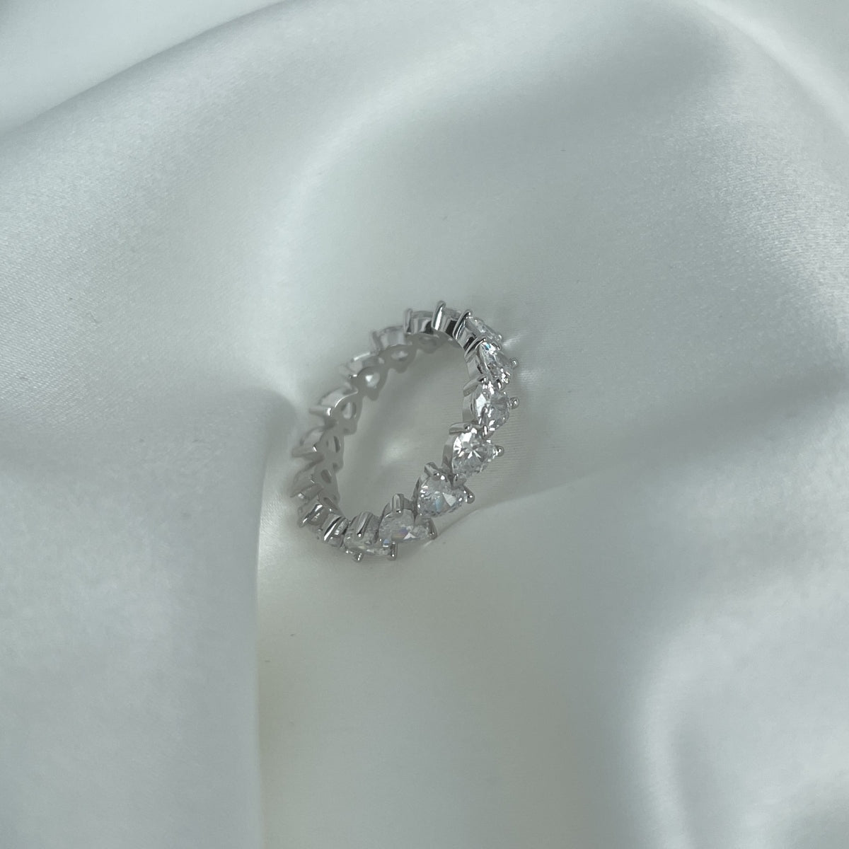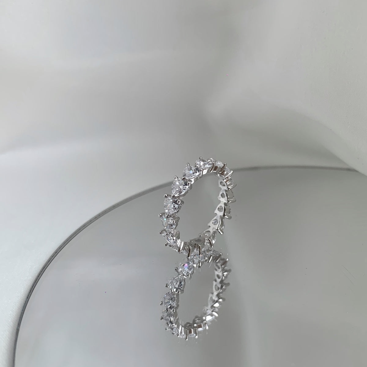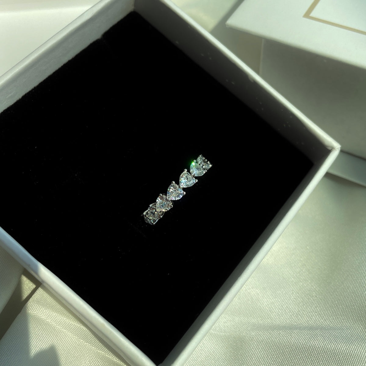 An elegant eternity ring crafted with multiple clear, heart-shaped stones. Designed for simplicity and beauty, this ring is ideal for stacking or wearing alone as a subtle statement piece.