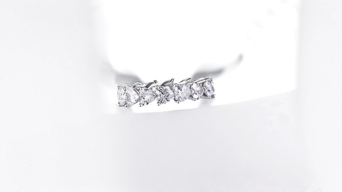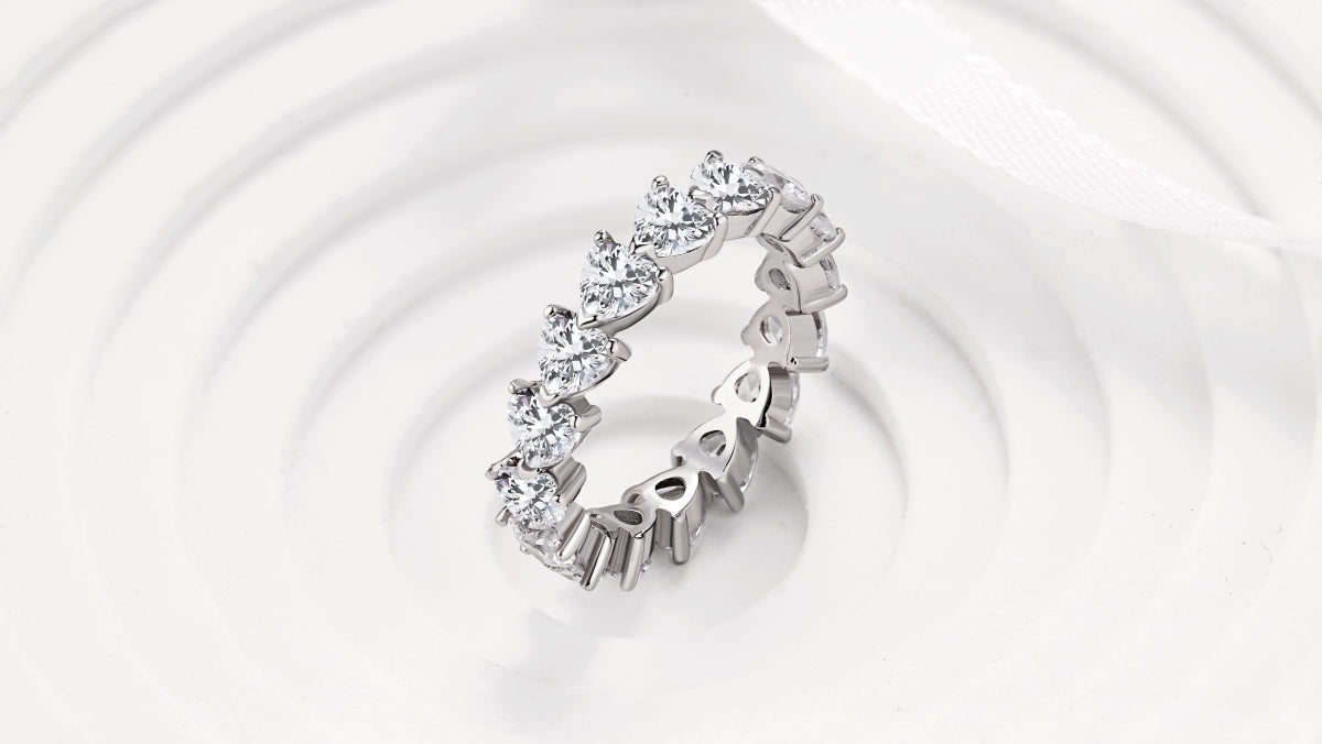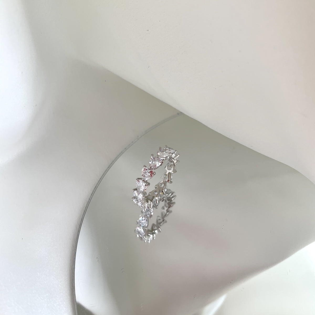 An elegant eternity ring crafted with multiple clear, heart-shaped stones. Designed for simplicity and beauty, this ring is ideal for stacking or wearing alone as a subtle statement piece.