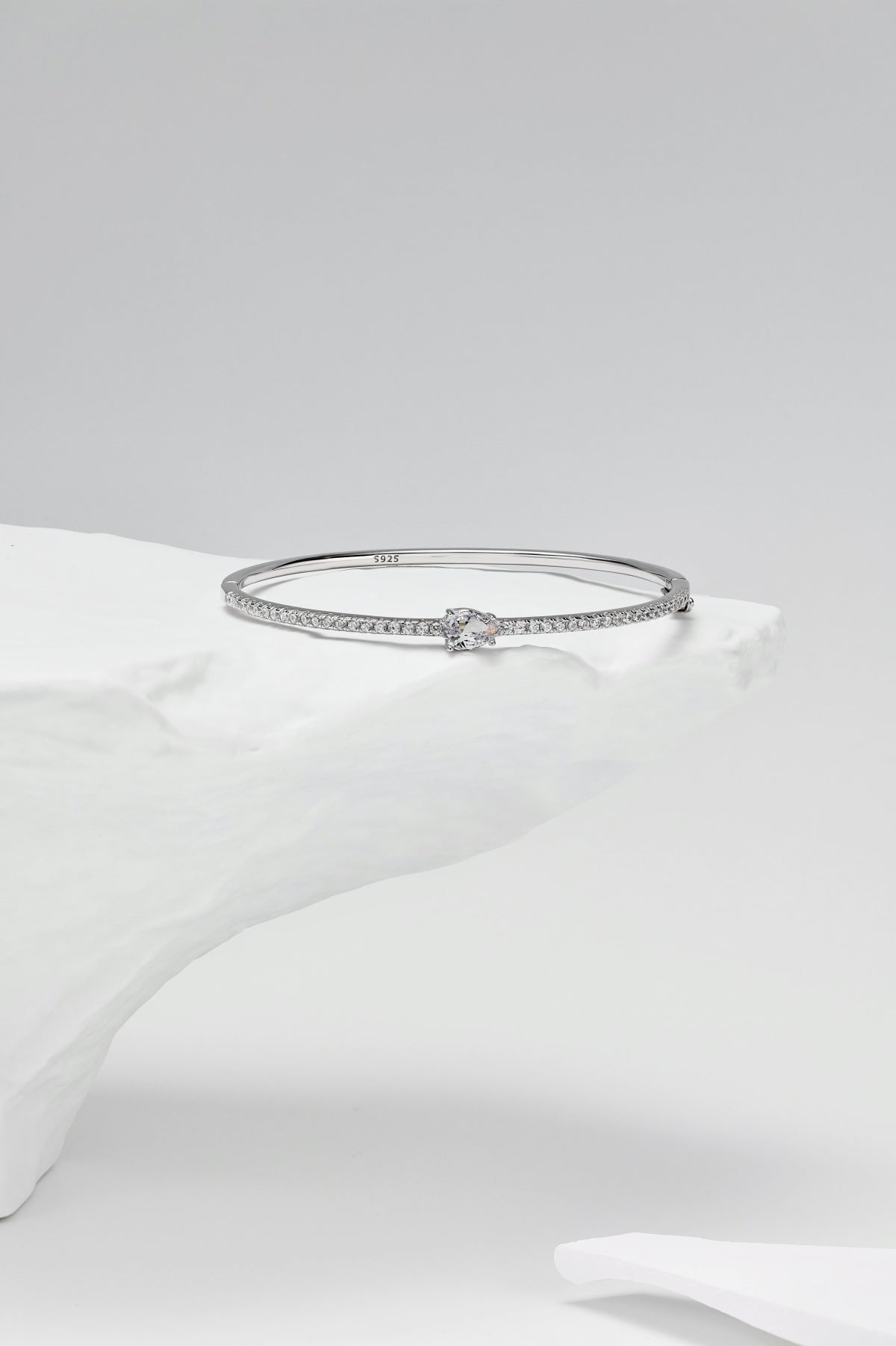 Modern sterling silver bangle with a cushion-cut center stone and pavé accents, perfect for a minimalist touch of sophistication.