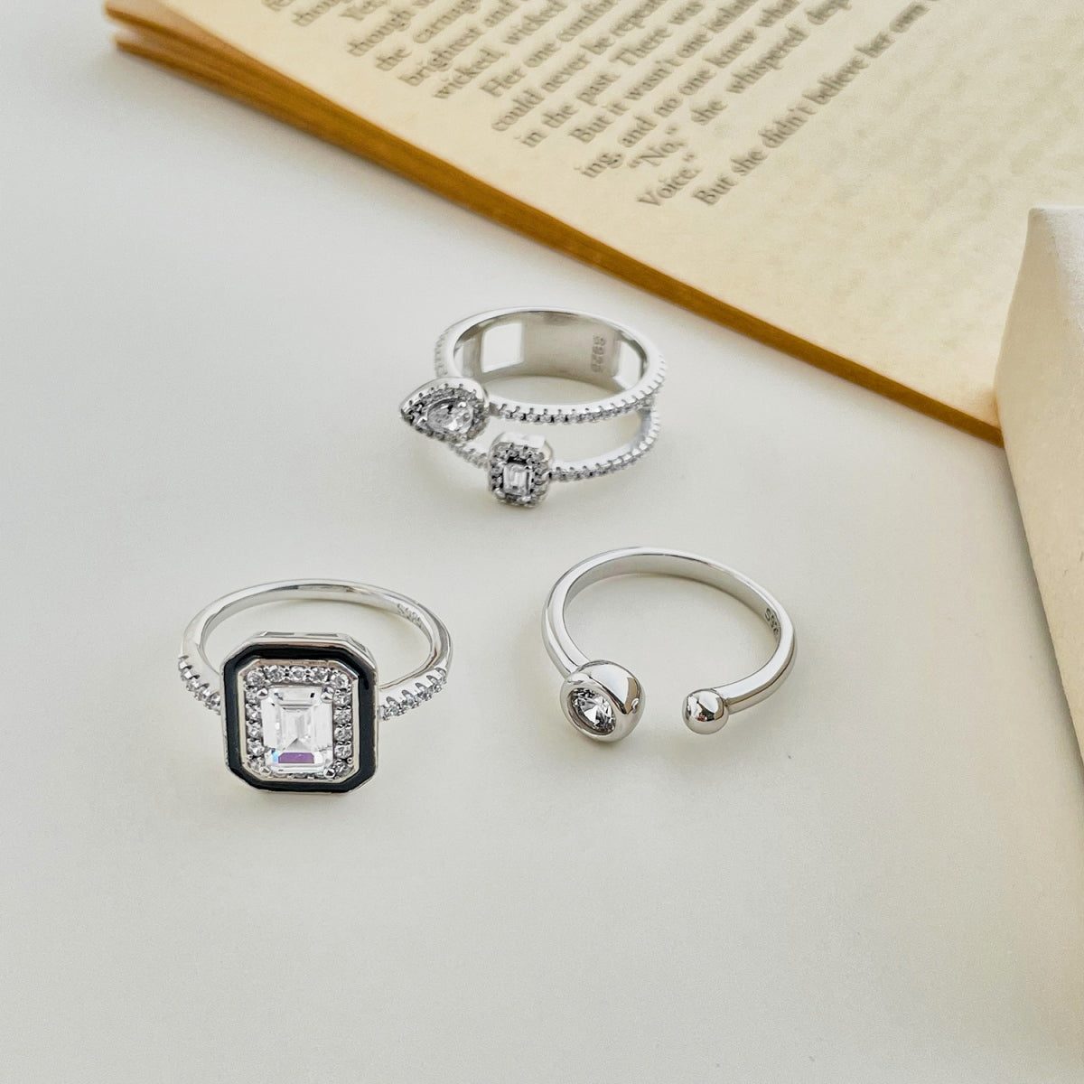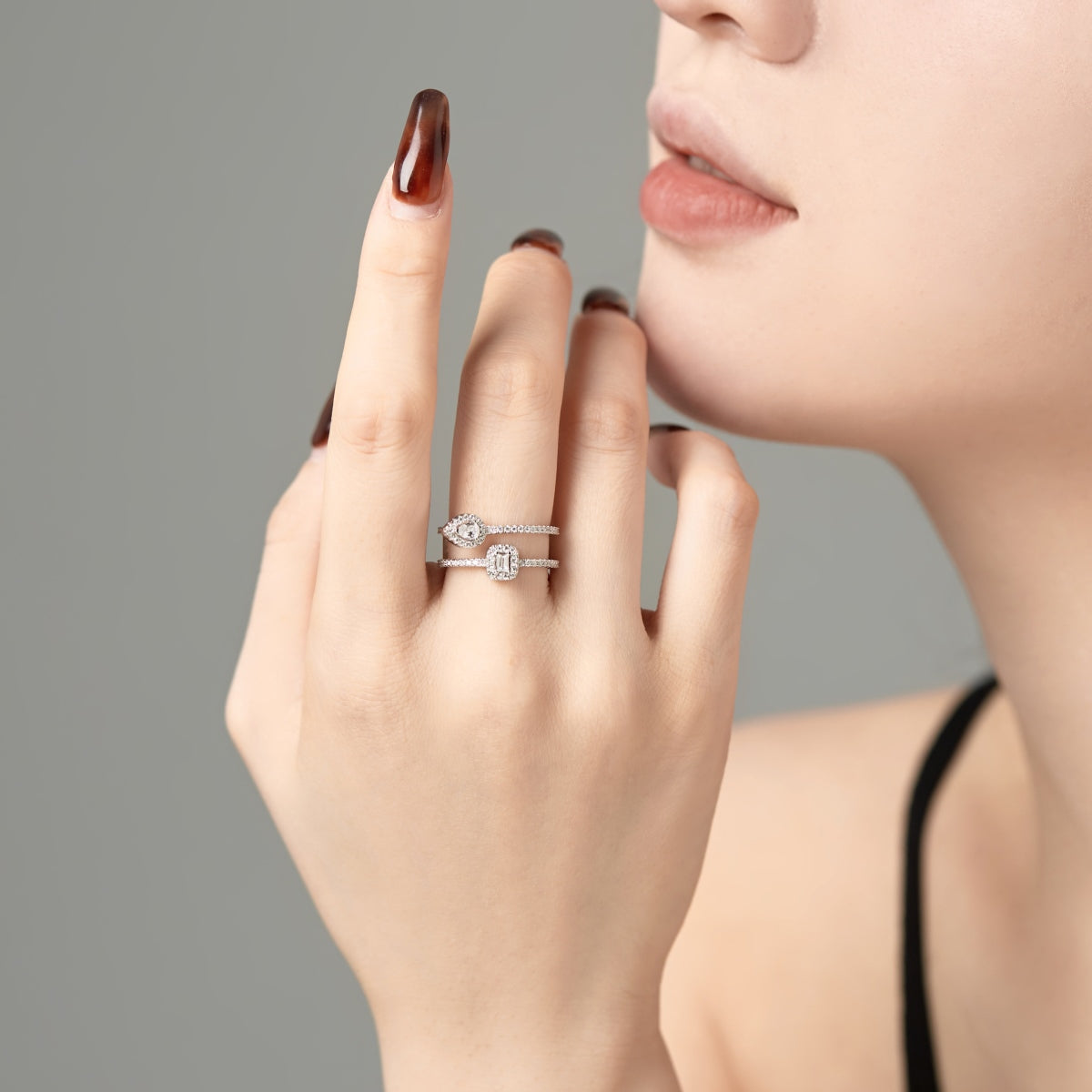 A sophisticated open-band ring featuring two haloed stones: a teardrop and an emerald cut. Designed with pavé diamonds surrounding the stones, it offers a luxurious feel. Perfect for both casual wear and special occasions.