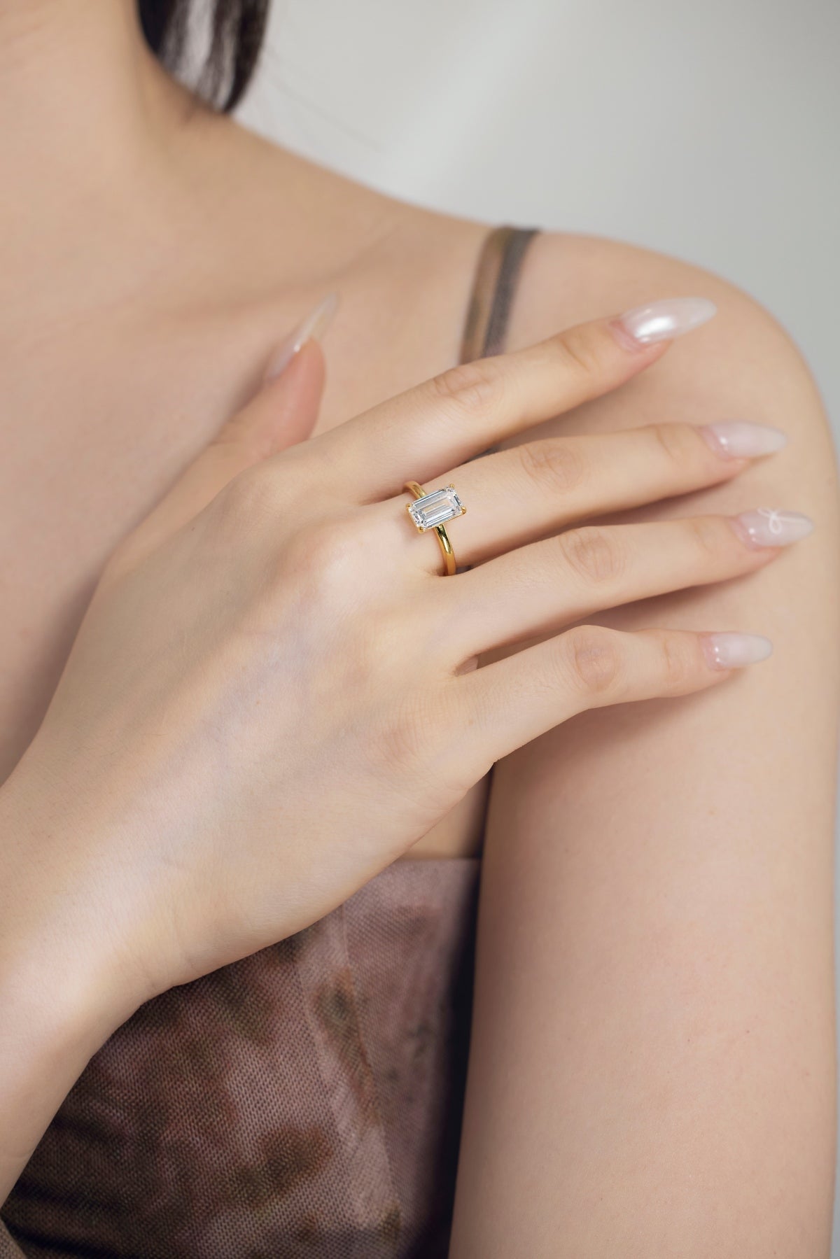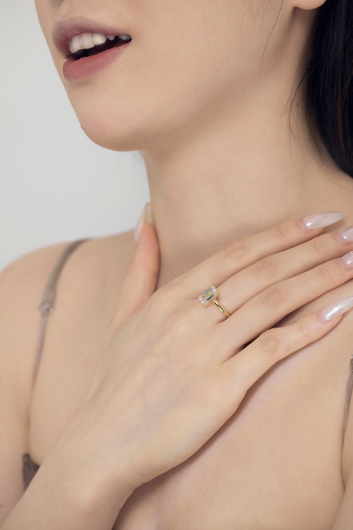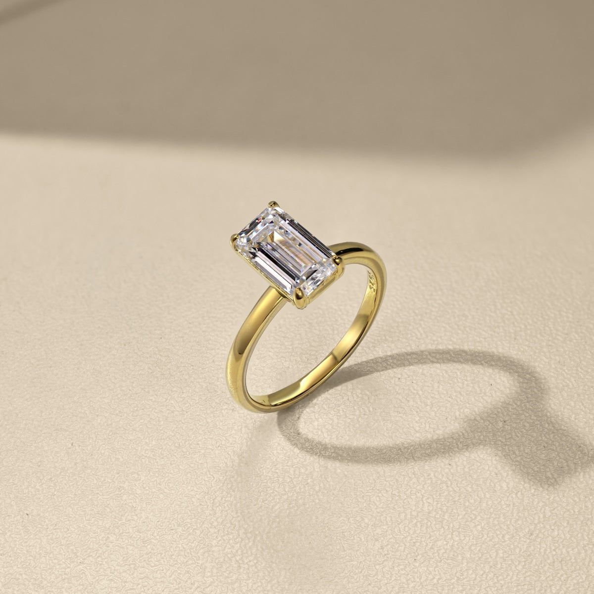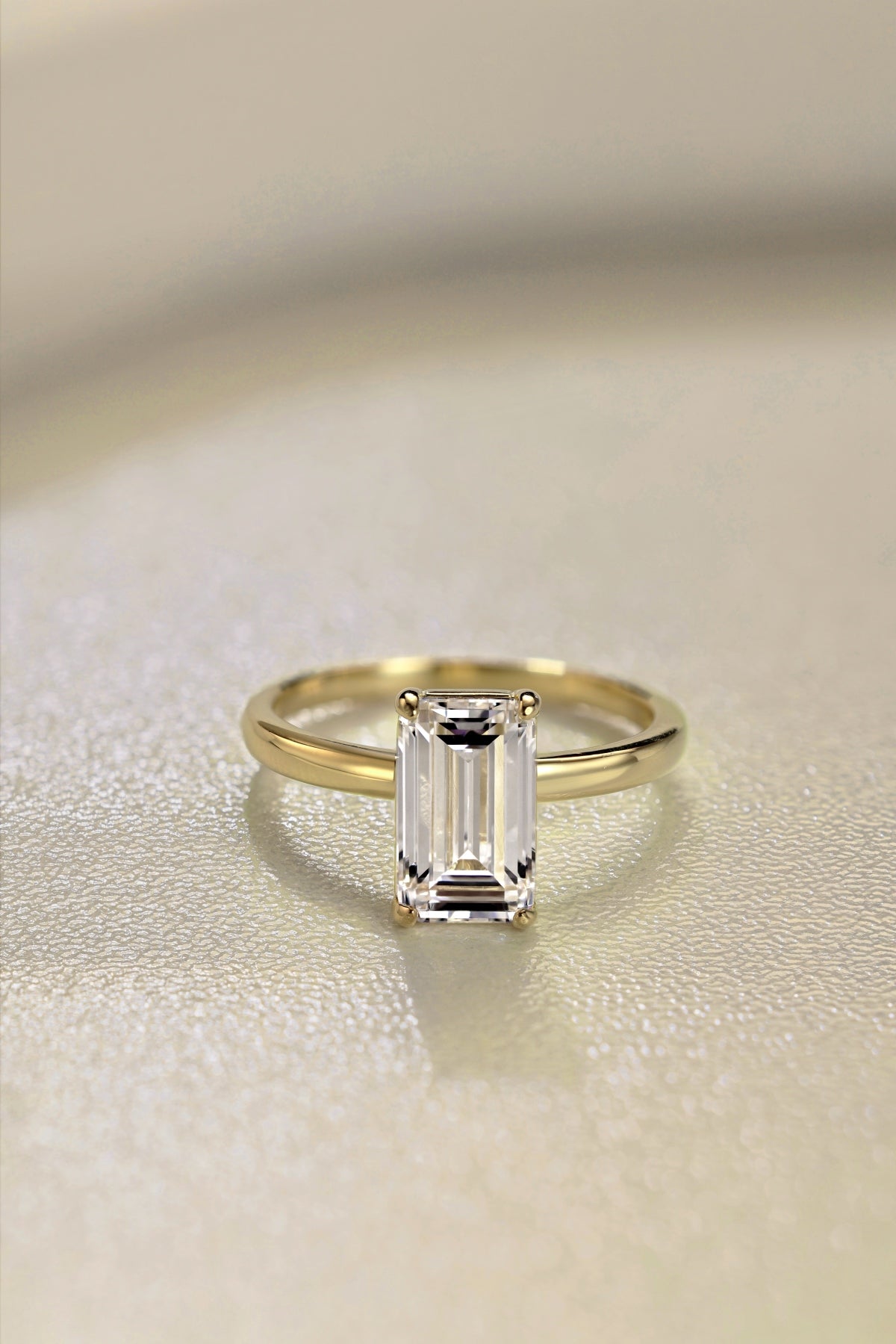 A sleek gold ring featuring an emerald-cut gemstone at the center, perfect for special occasions or daily wear.