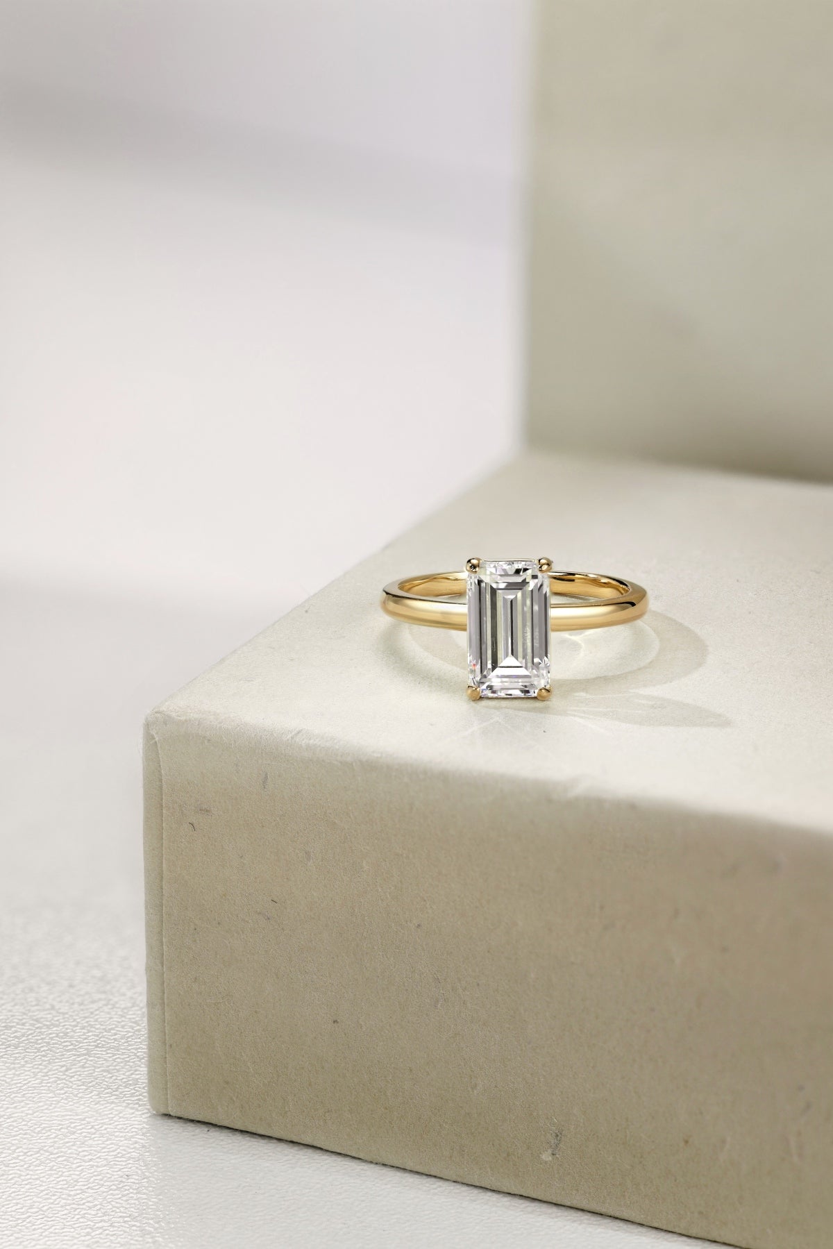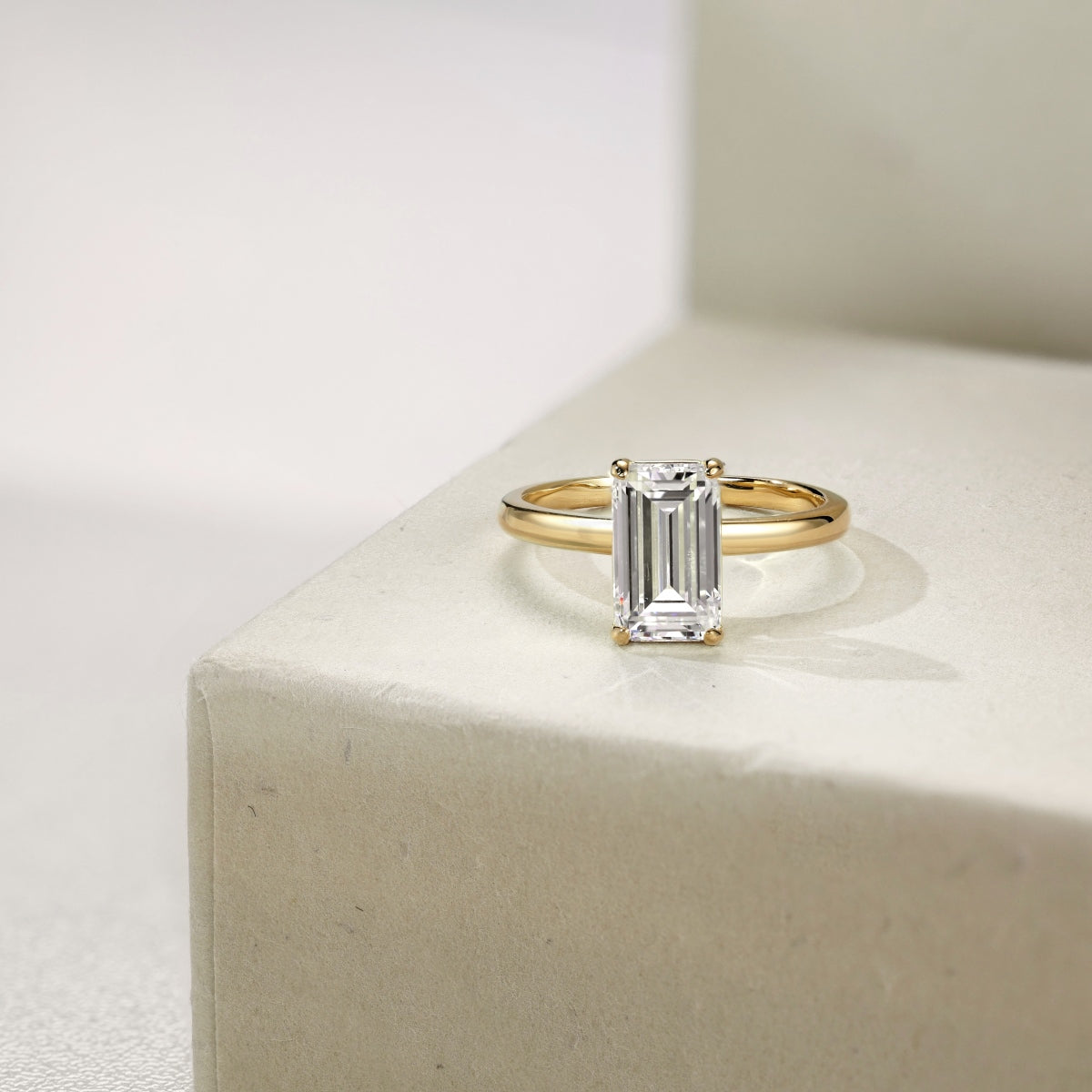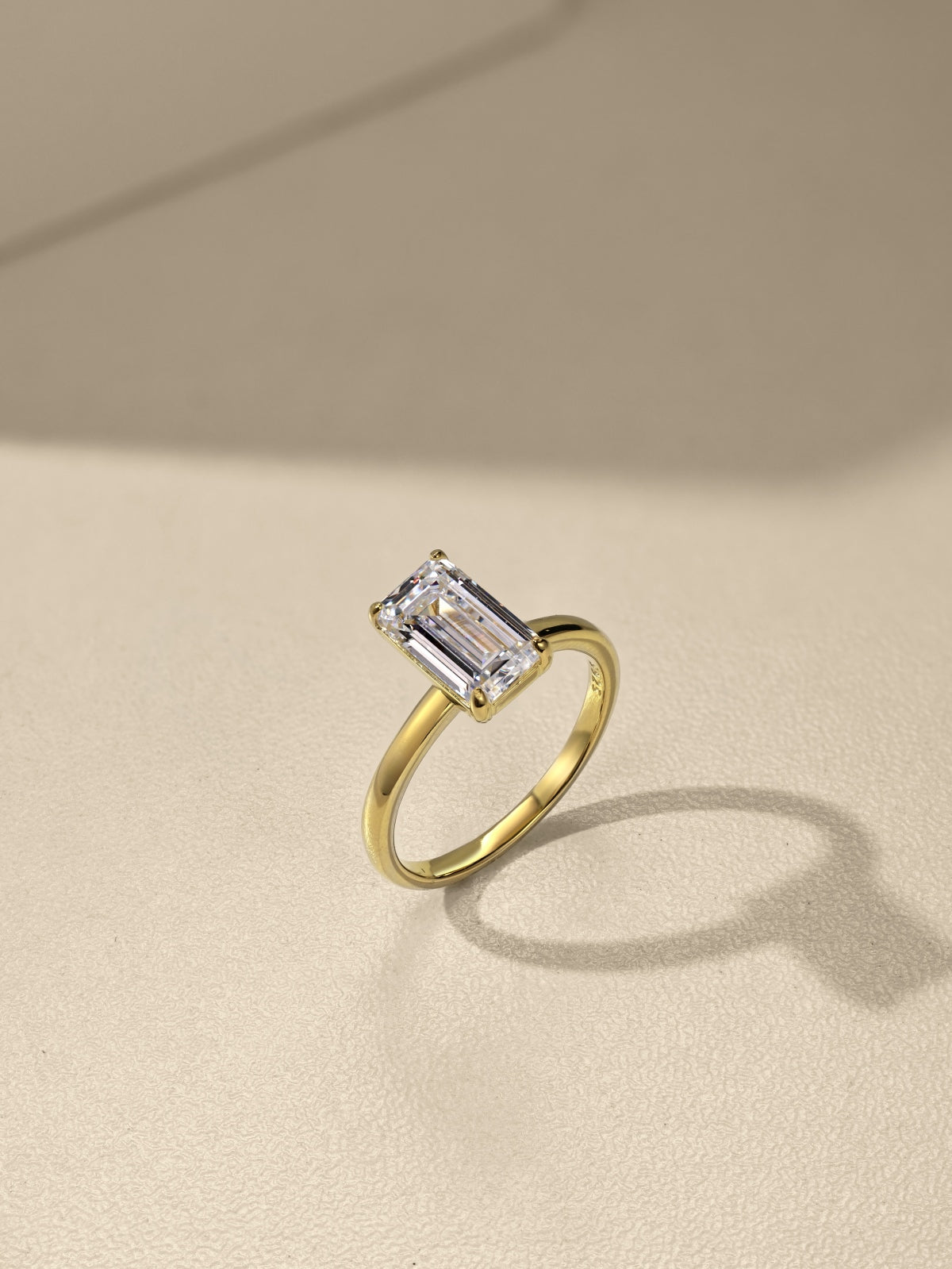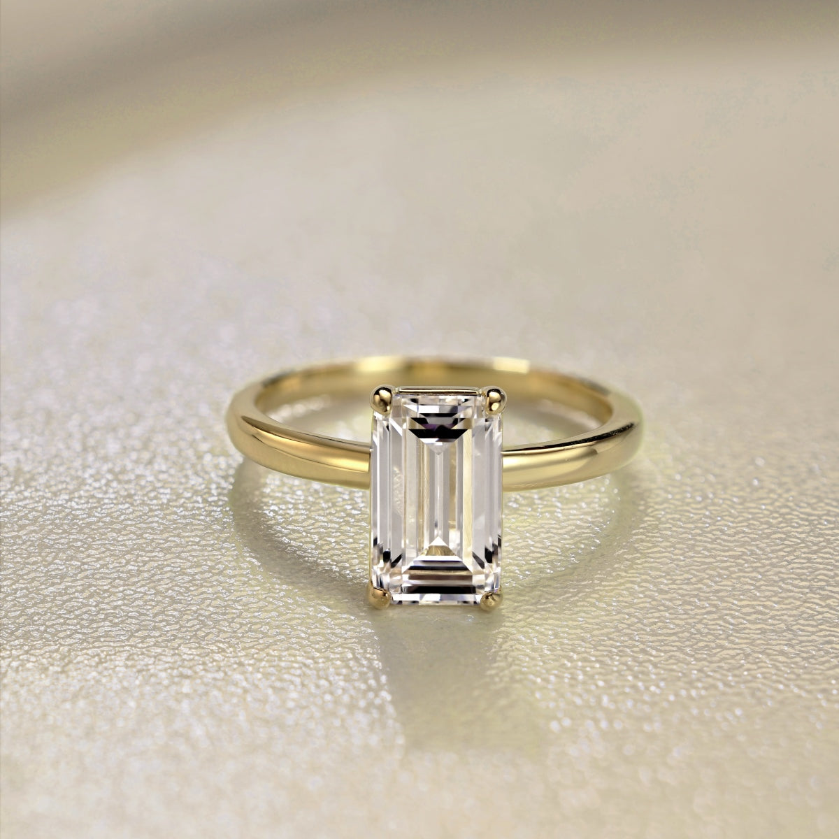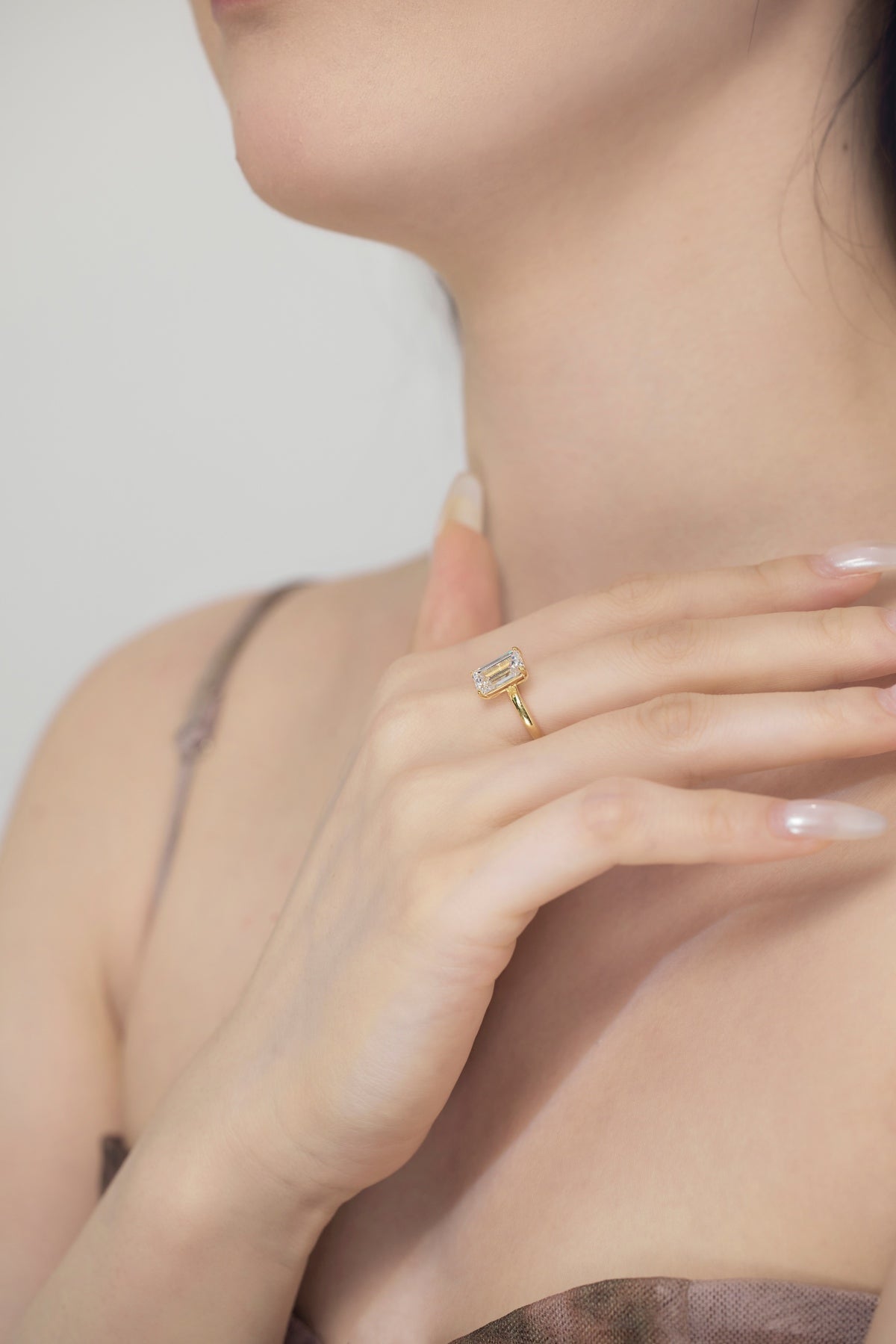A sleek gold ring featuring an emerald-cut gemstone at the center, perfect for special occasions or daily wear.