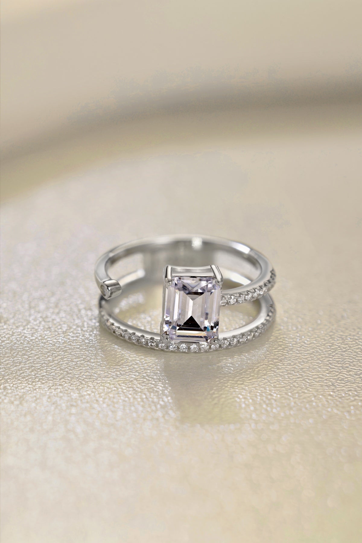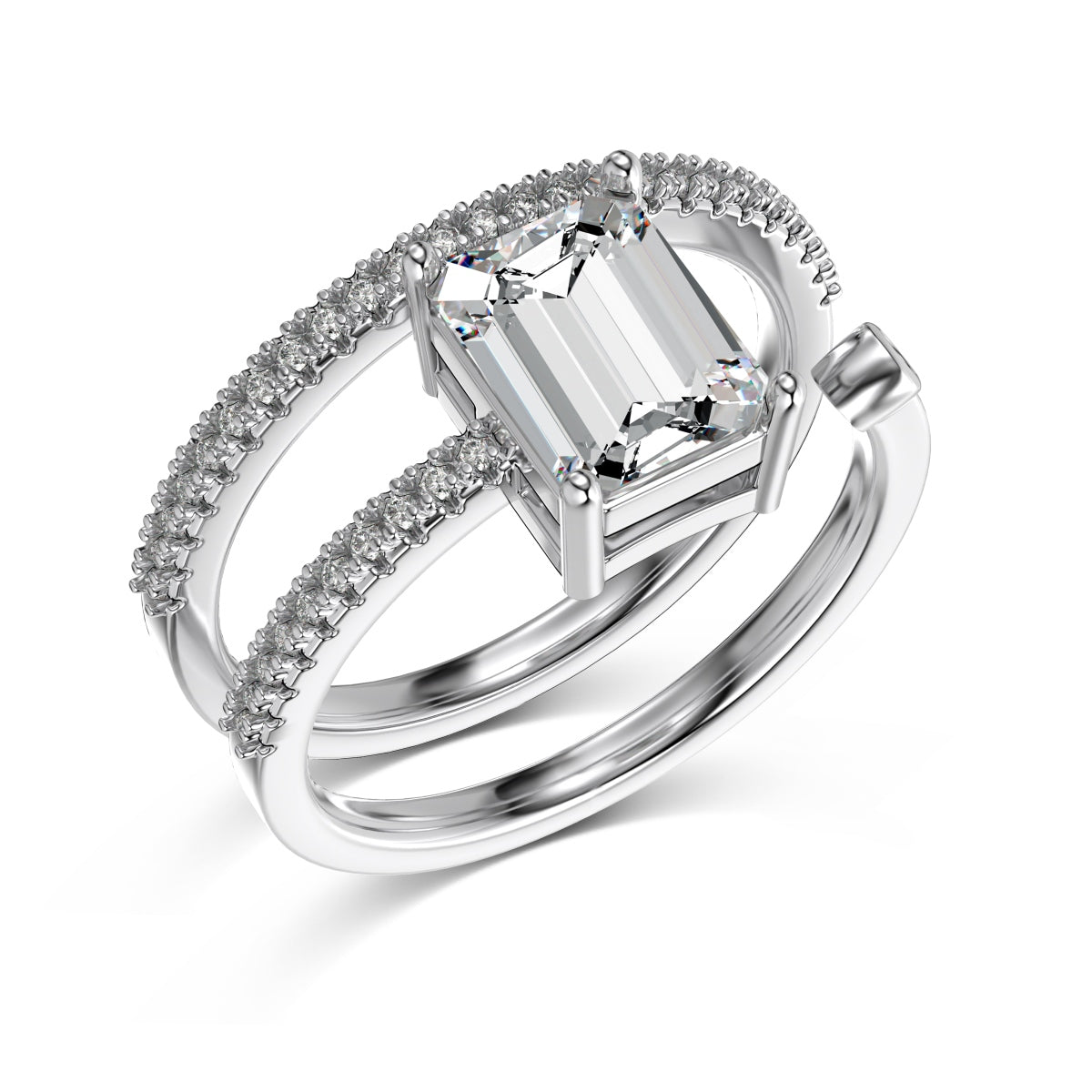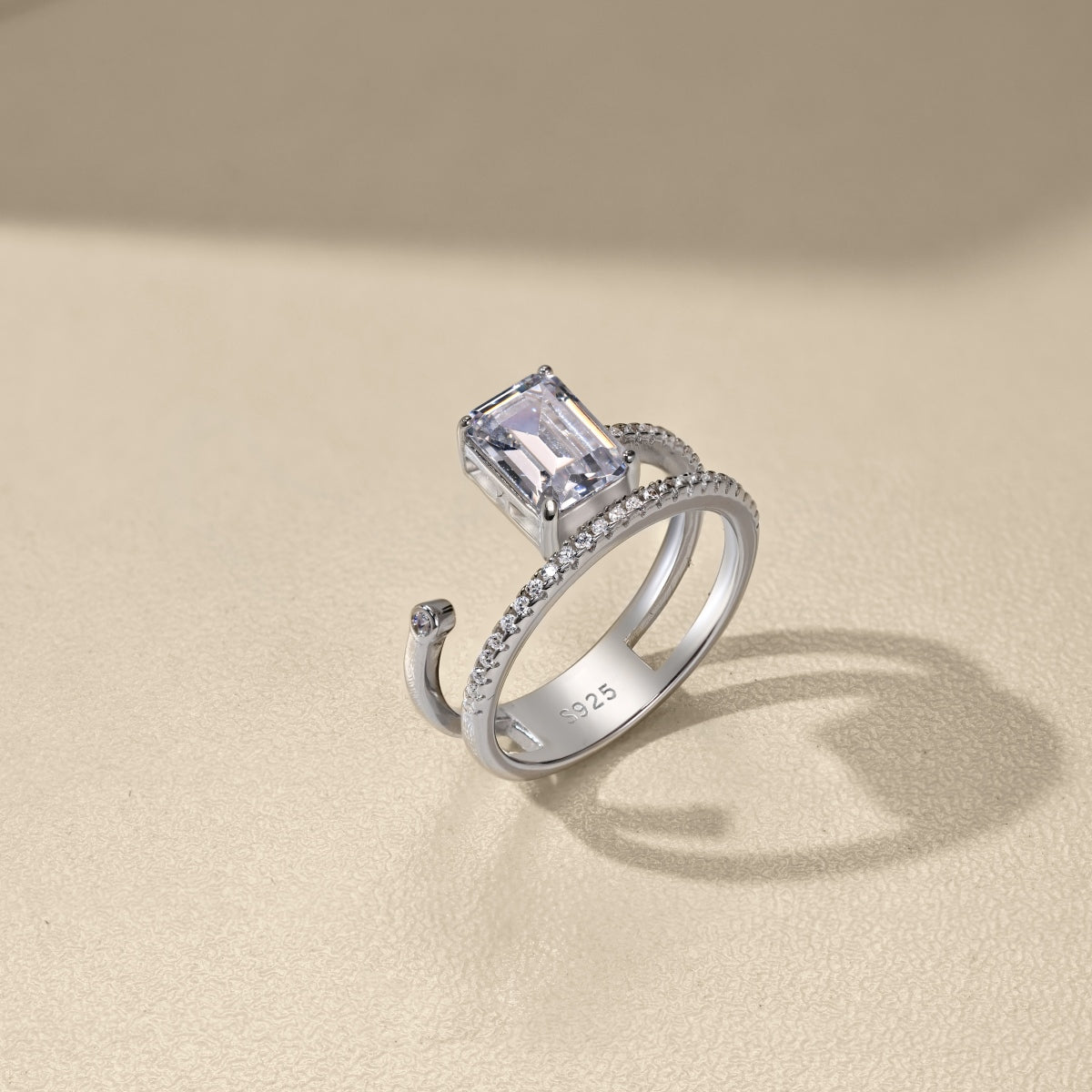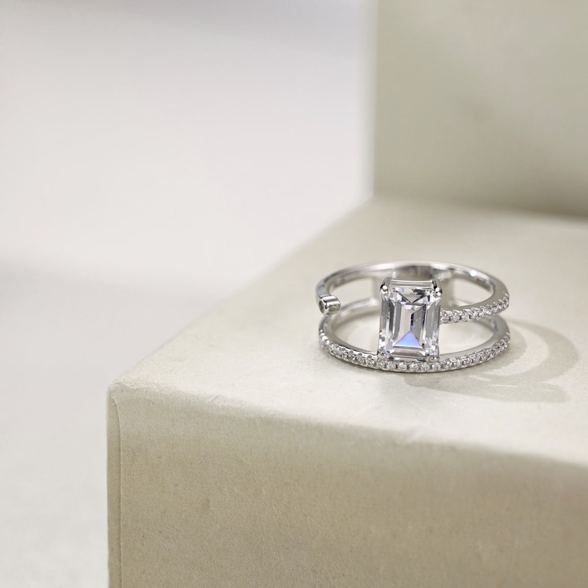 A classic and elegant ring featuring a large emerald-cut stone with a sleek band adorned with small shimmering stones.