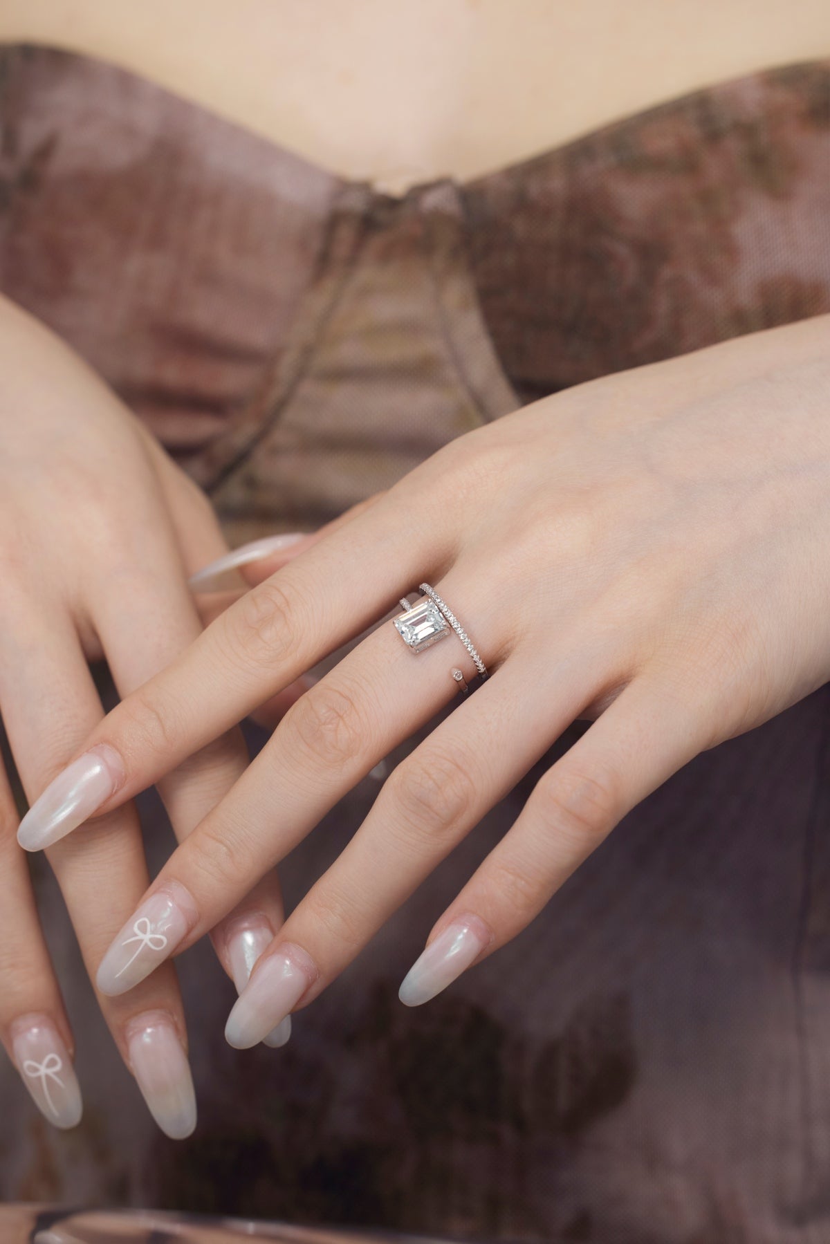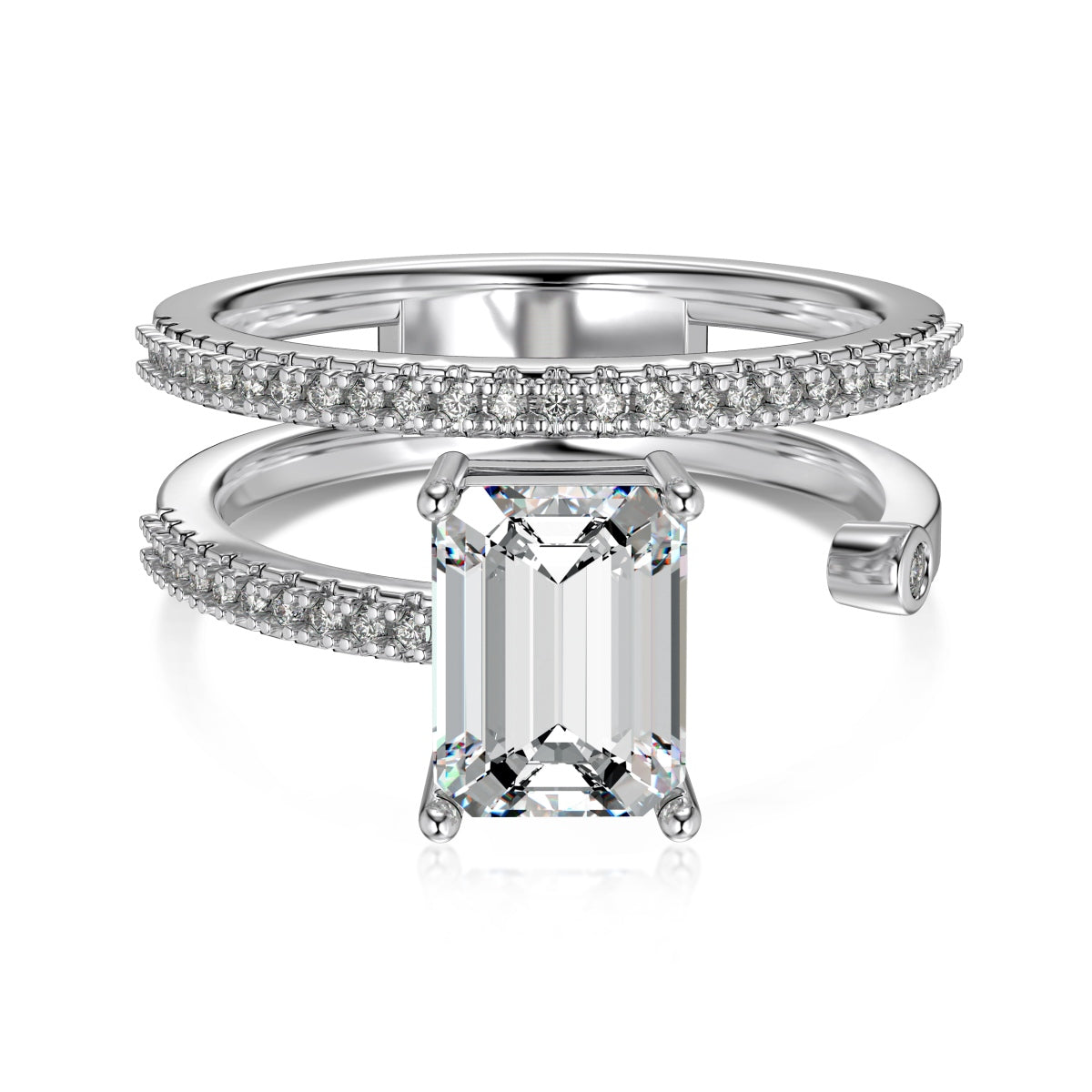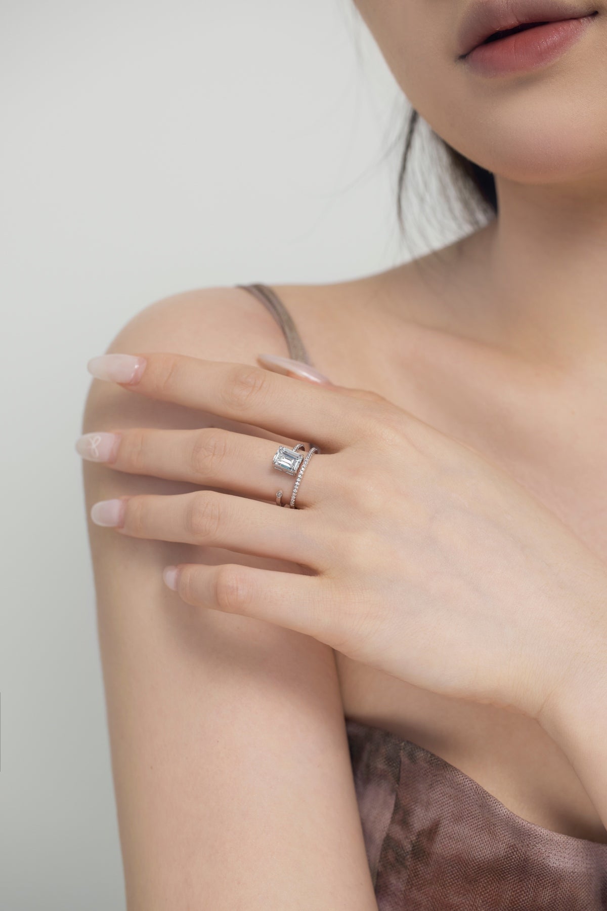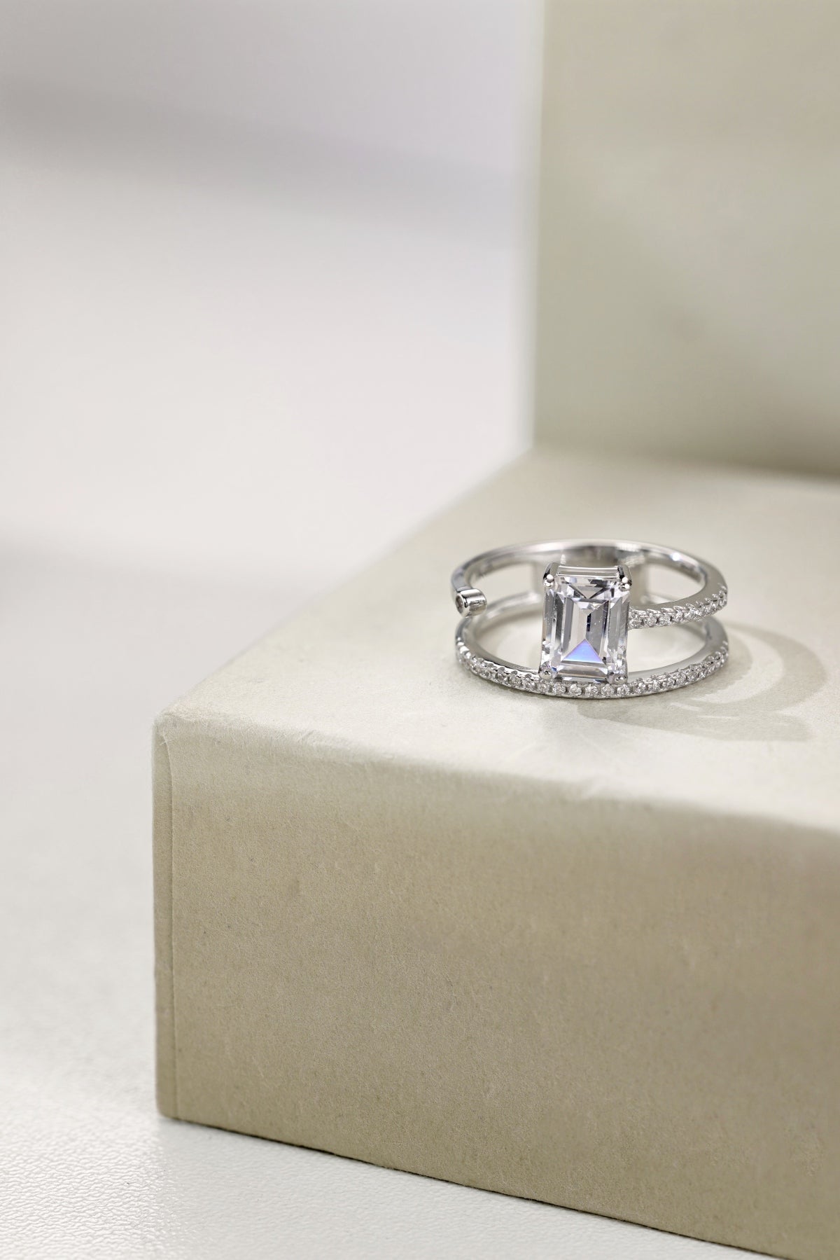 A classic and elegant ring featuring a large emerald-cut stone with a sleek band adorned with small shimmering stones.