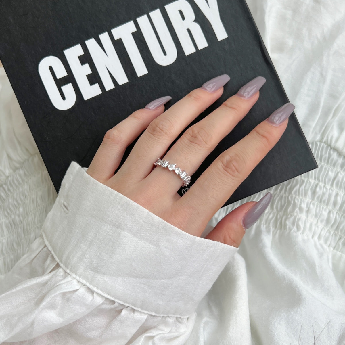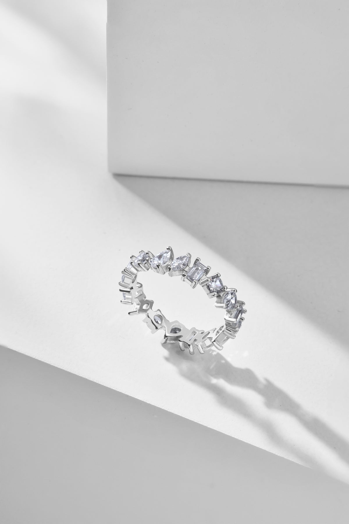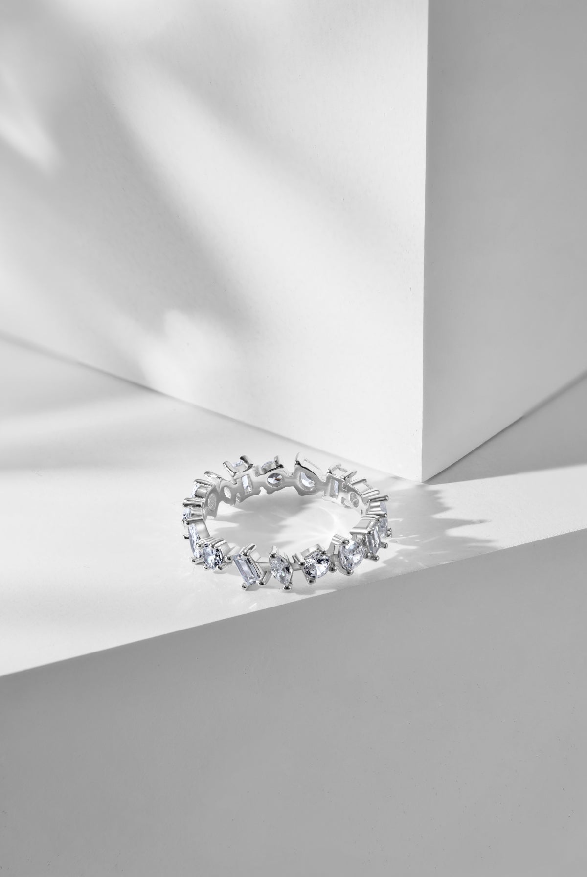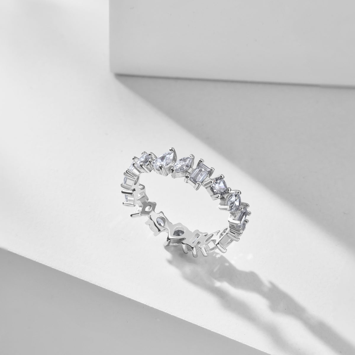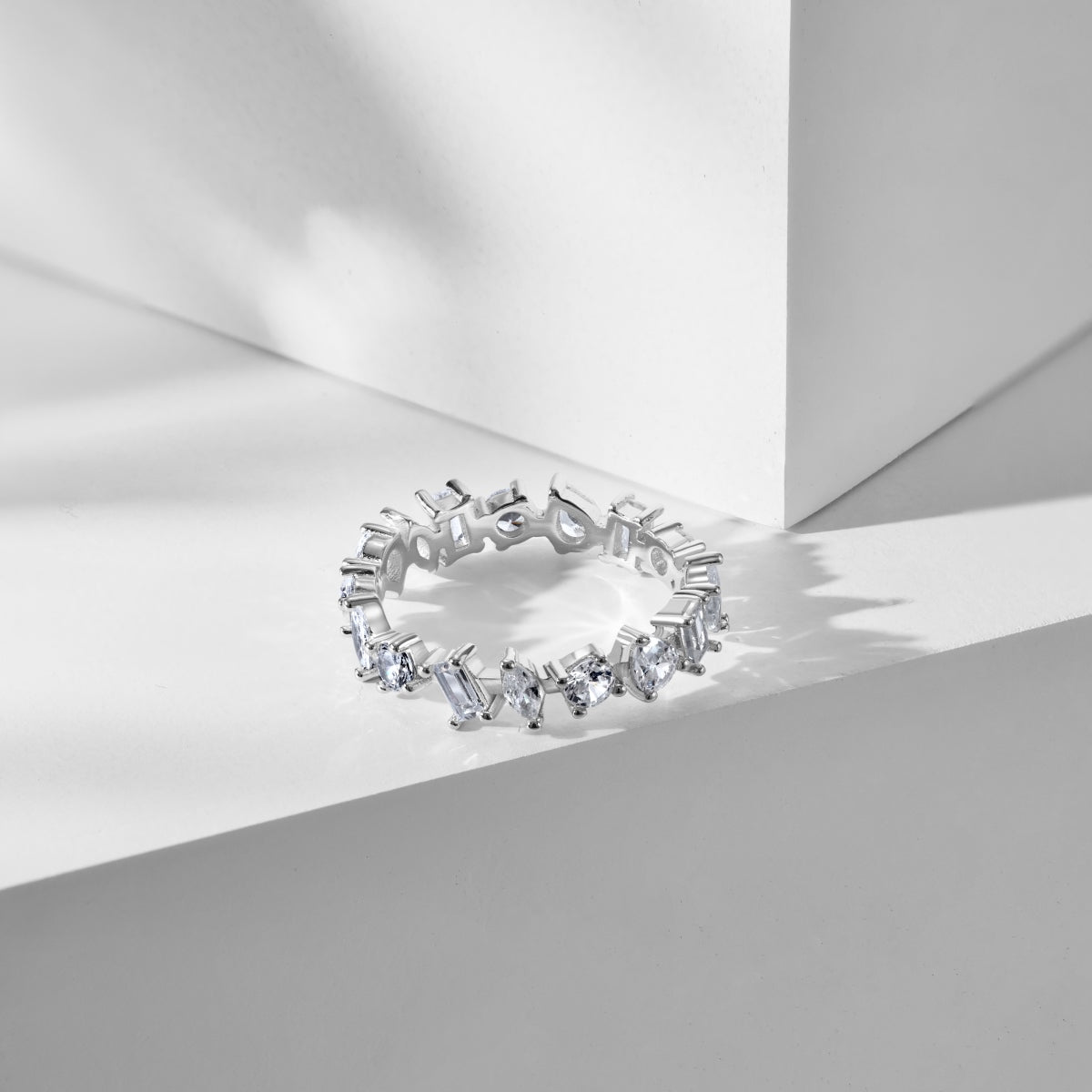 A silver version of the eternity ring with a dazzling mix of marquise, emerald, and round-cut stones. Symbolic of lasting beauty and elegance.