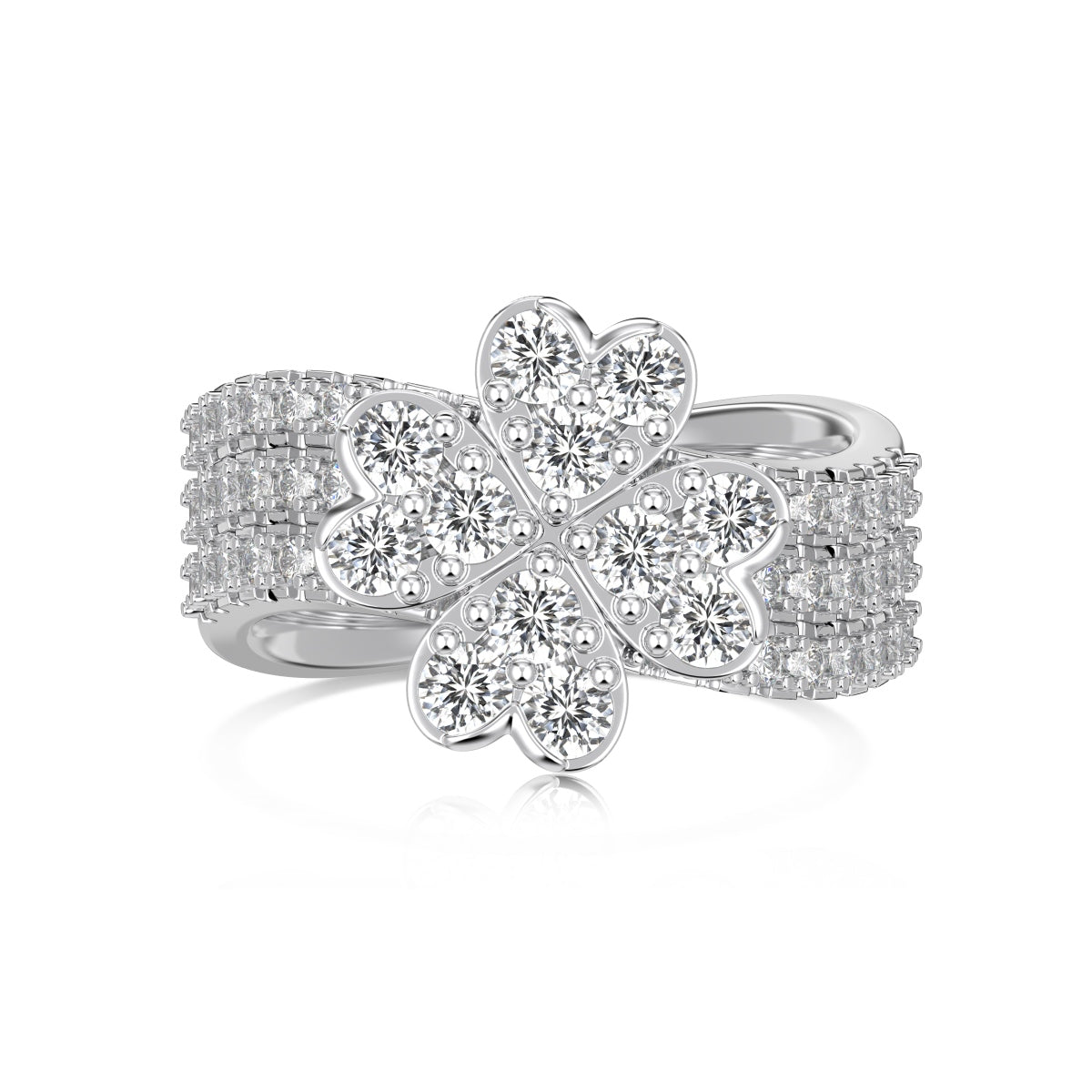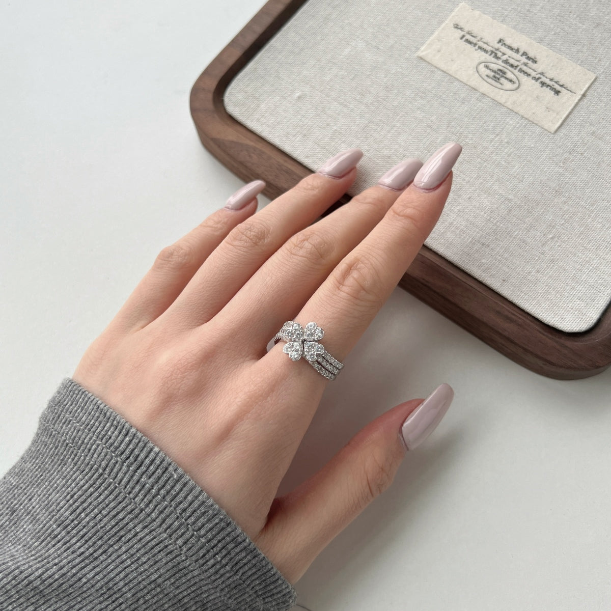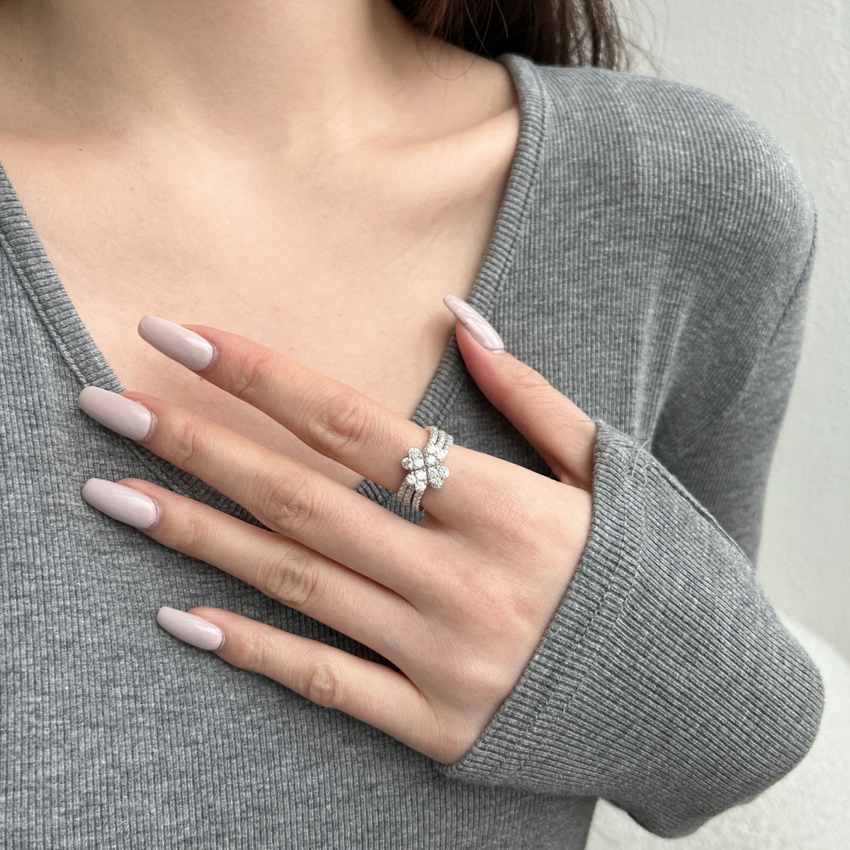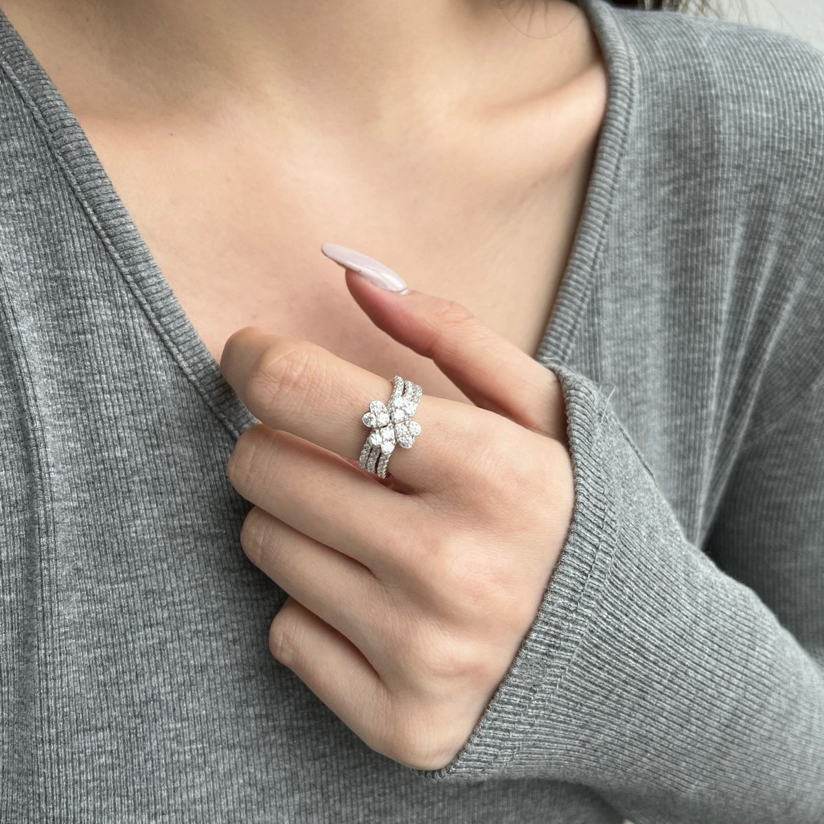 A charming silver floral ring adorned with cluster-cut stones in a floral motif, adding a nature-inspired beauty to your style.