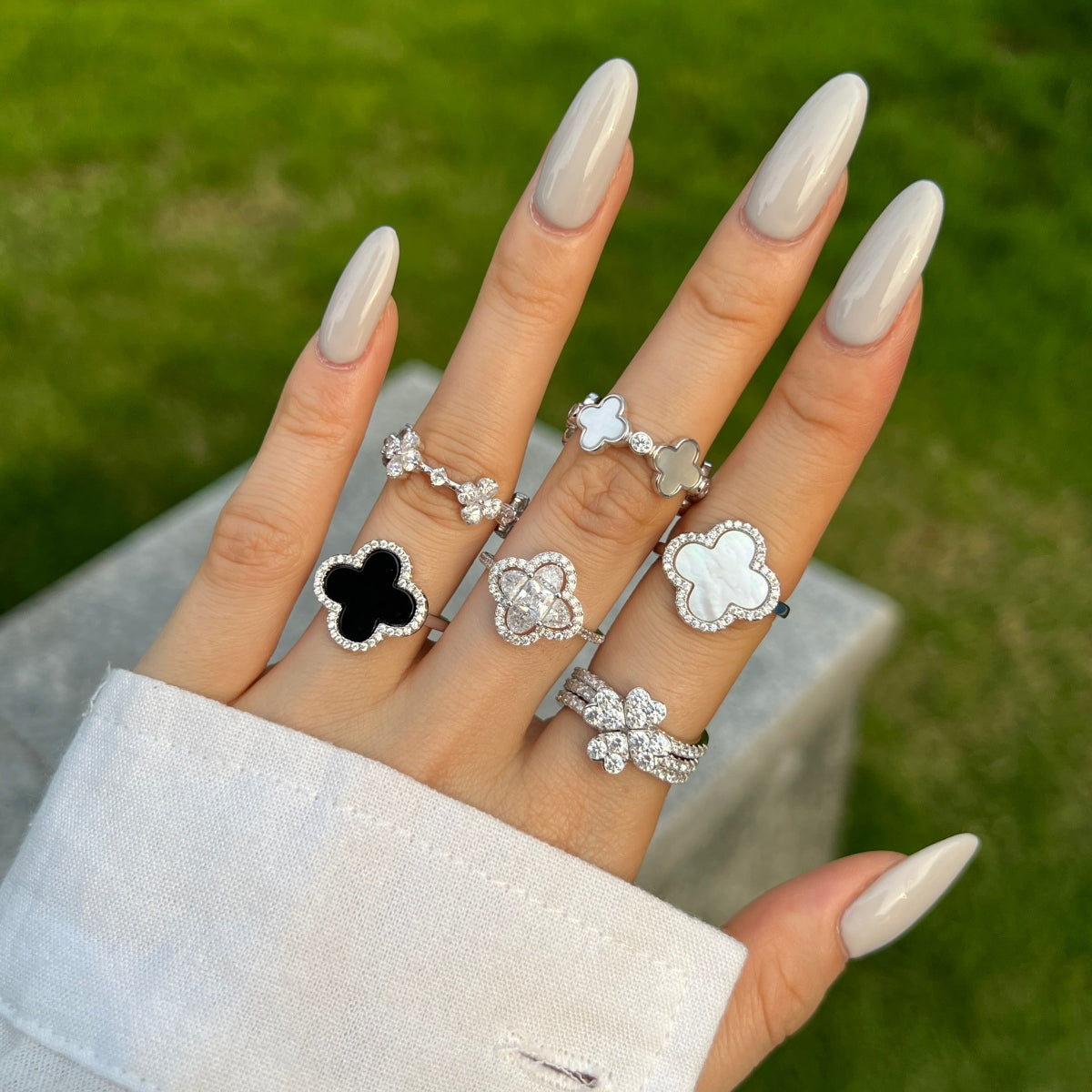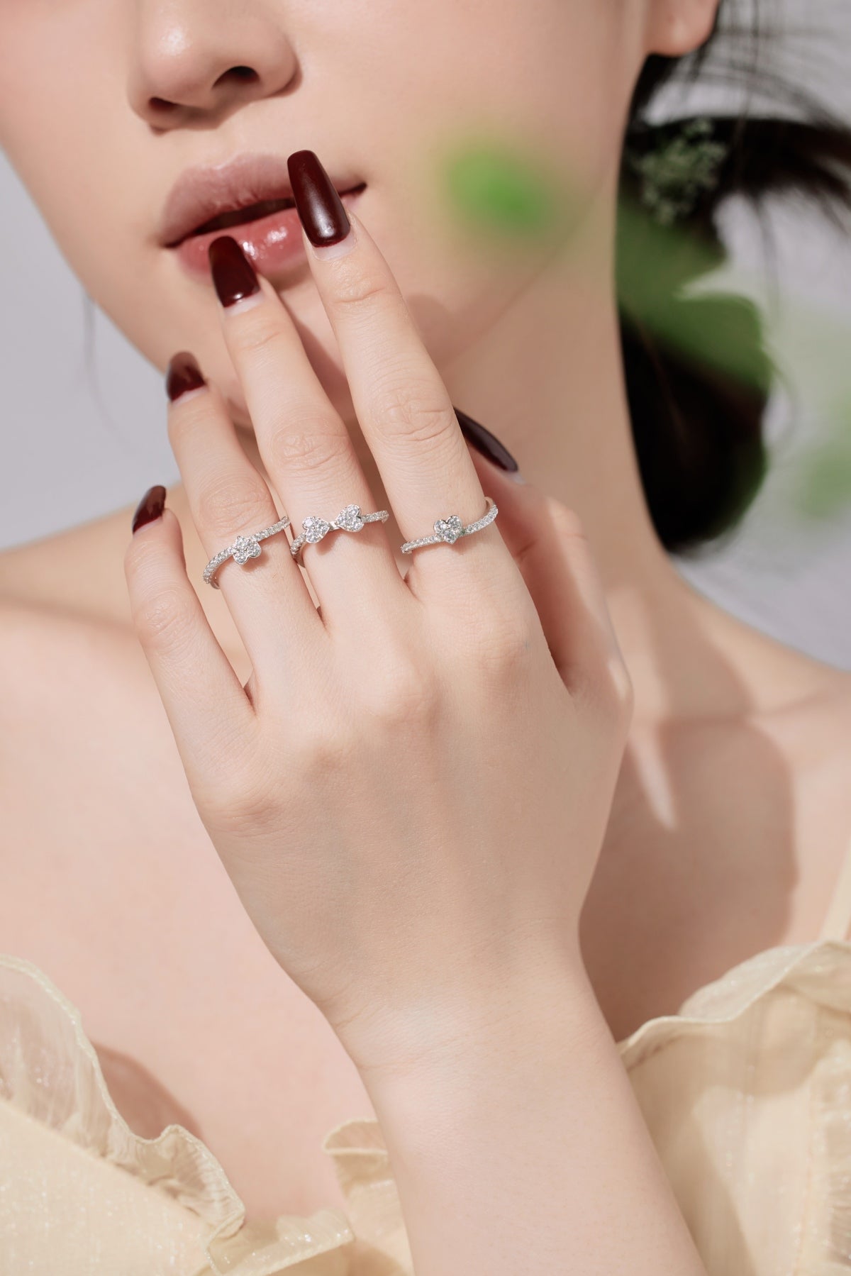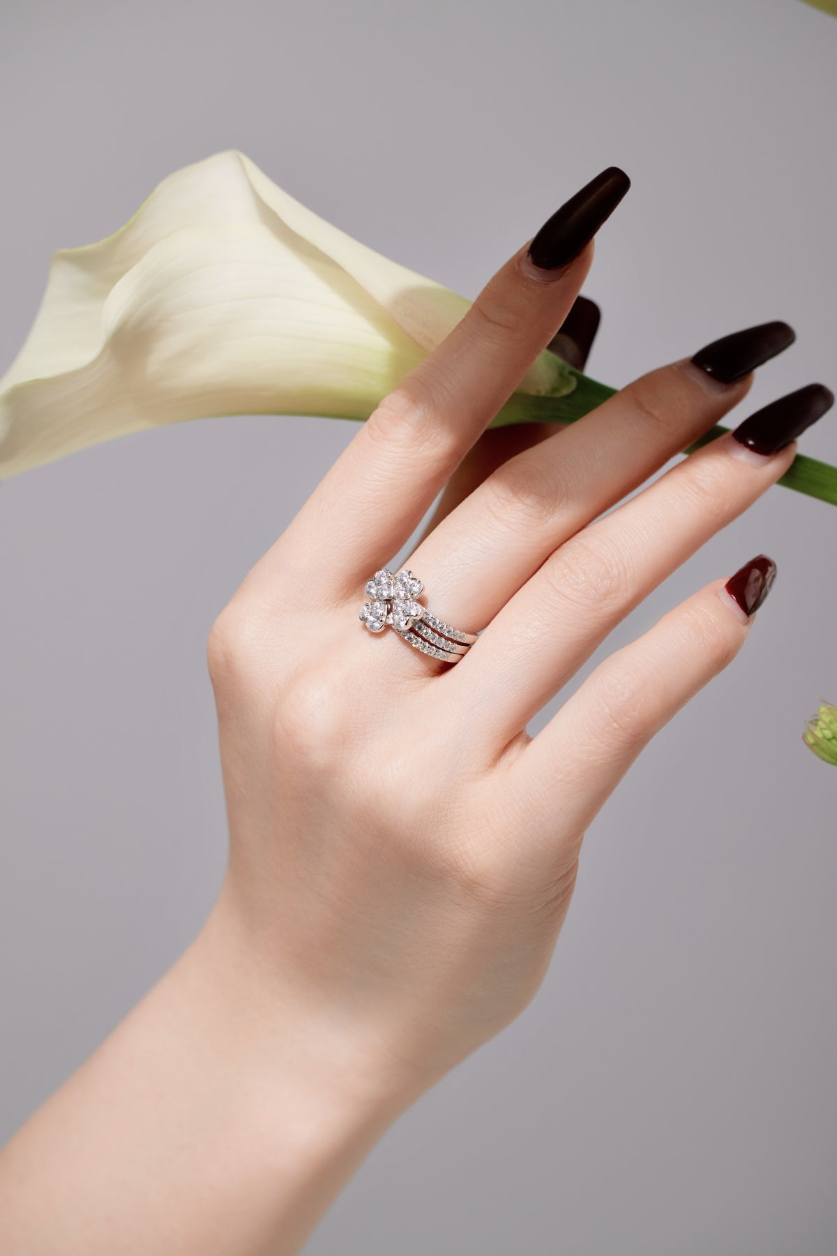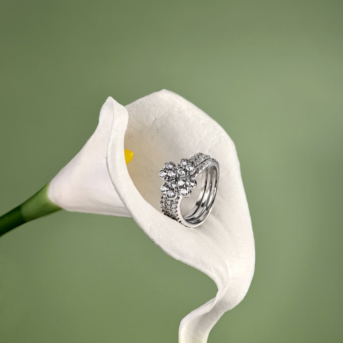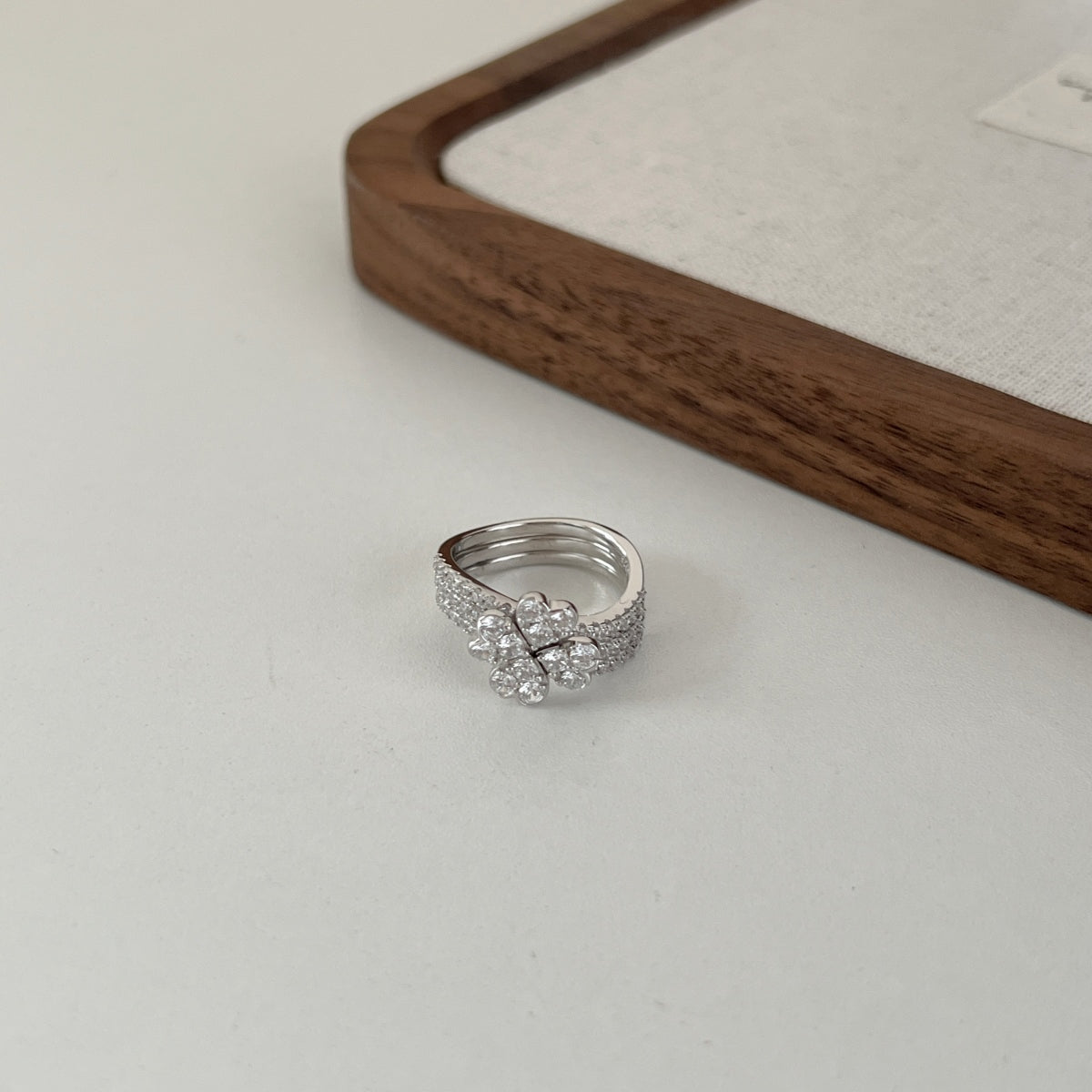 A charming silver floral ring adorned with cluster-cut stones in a floral motif, adding a nature-inspired beauty to your style.
