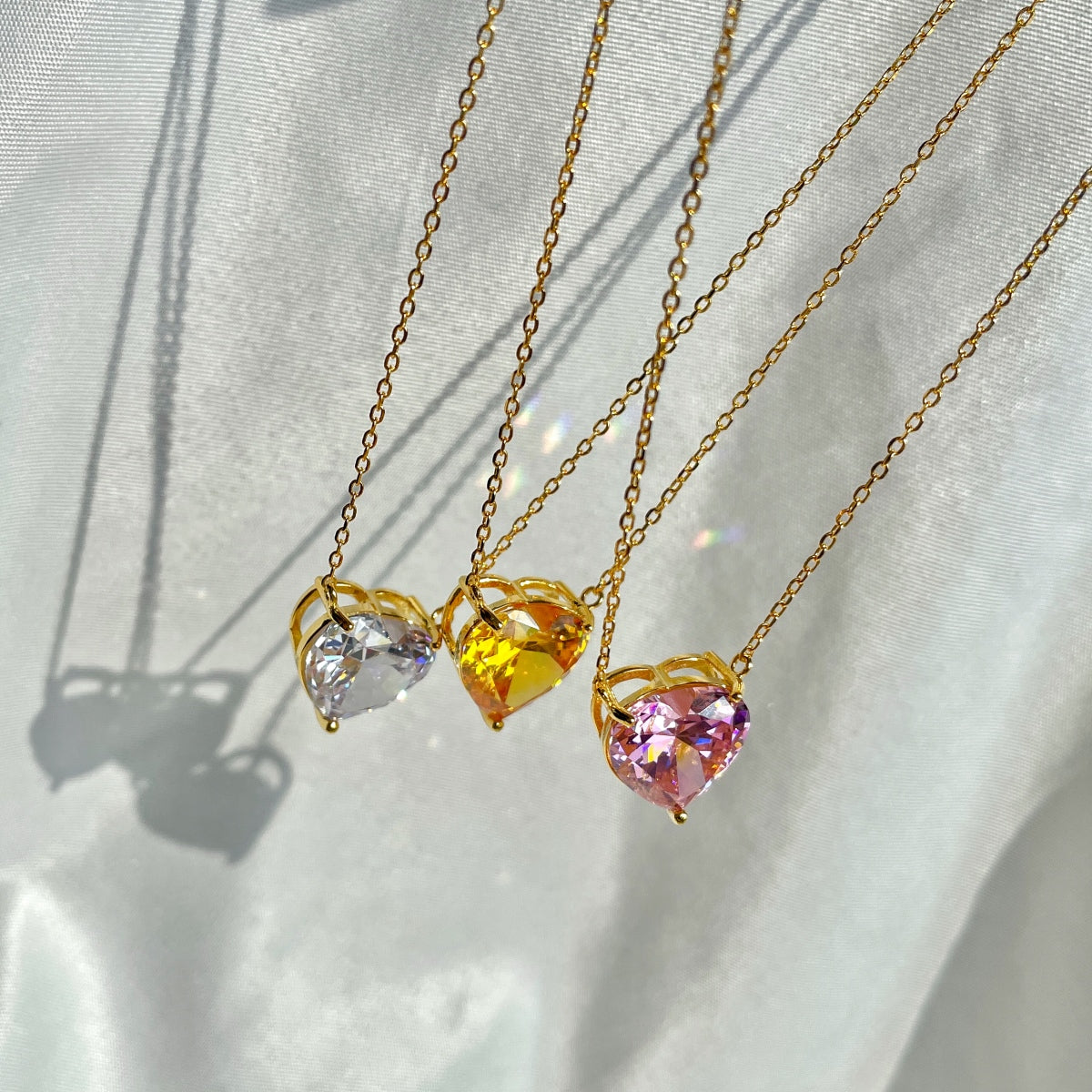 This elegant necklace features a brilliant heart-shaped gemstone delicately set in gold, suspended from a matching gold chain. Its timeless design symbolizes love and adds a touch of sophistication to any outfit. Perfect for gifting or adding a personal touch to your jewelry collection.